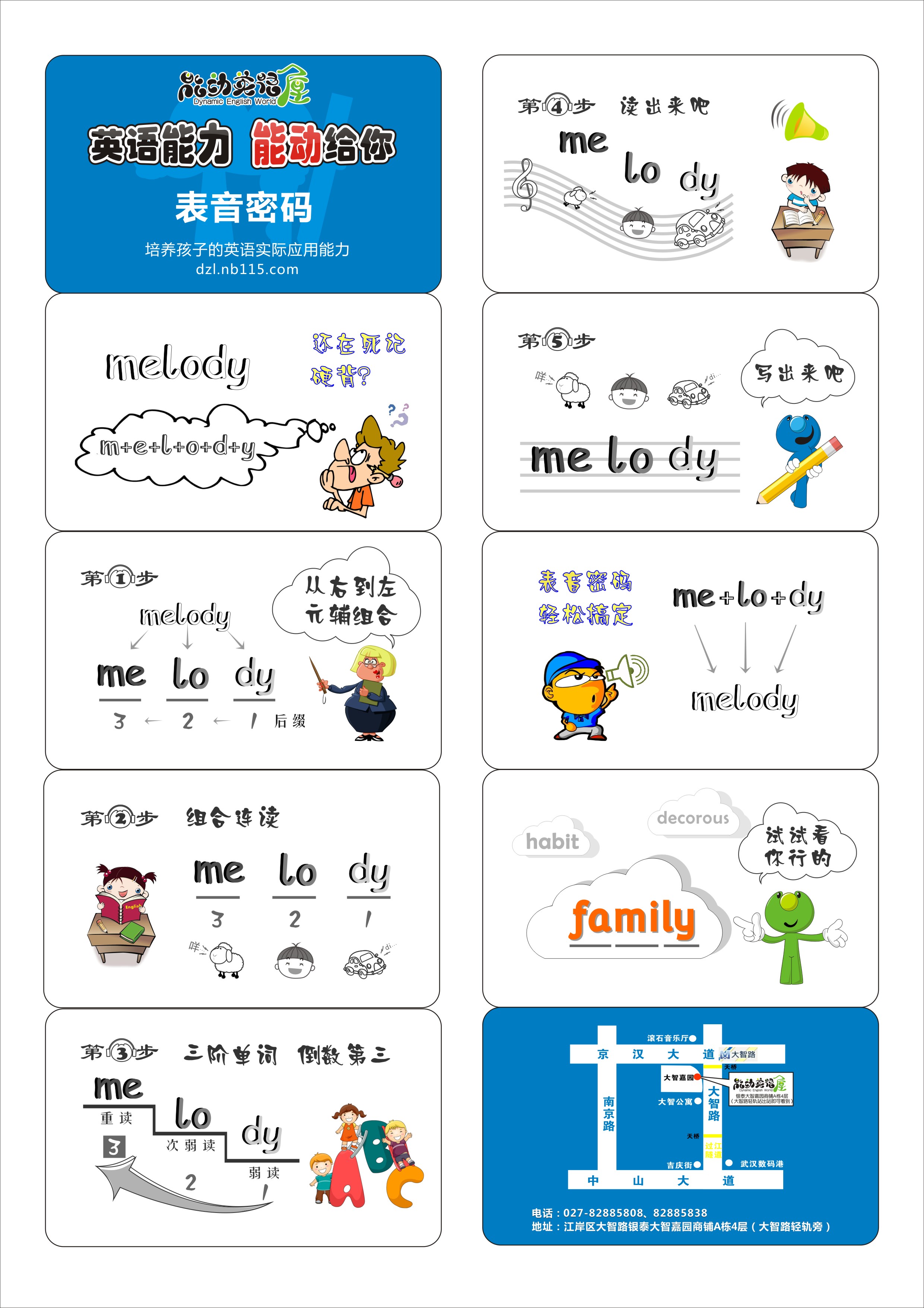 能动英语屋武汉大智路能动英语屋(武汉大智路)是由武汉泽音教育发展有限公司兼承能动英语"让英语能动起来,让我们能动世界"的发展理念,遵循能动英语总部统一标准而运营的一家能动英语屋。能动英语屋(武汉大智路)采用全国统一的经营管理模式,在能动英语总部整体规划下进行专业化分工,并在分工基础上实施集中化管理。能动英语总部提供统一的VI形象、统一的教学产品、统一的课程体系、标准化的教学方法,面向适龄学生提供能动英语标准化的优质英语学习指导和培训服务。