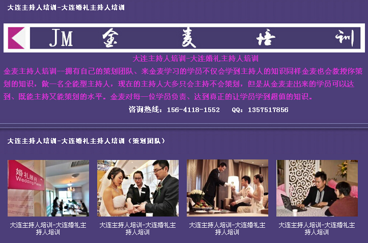 大连婚礼主持人培训、大连婚礼司仪培训、大连婚庆主持人培训、大连婚庆司仪培训、大连婚礼策划师培训、大连主持人培训大连金麦主持人培训机构专为2015年想成为主持人的朋友特设的一们课程,致力于培养更多的优秀主持人,让每一个想上舞台的朋友都能实现梦想,在这里,我们圆你“主持人”的梦!机会就在这里,不要错过了!成功从这里起航!!