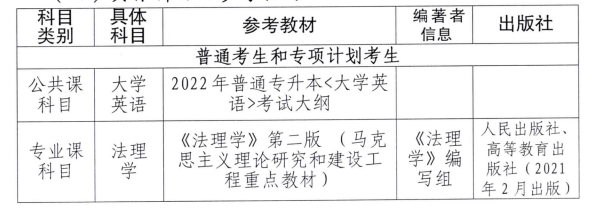 公共课科目统一为《大学英语》,专业课科目分别是:法学专业为《法理学》;英语专业为《综合英语》(含听力,占20分);计算机科学与技术专业和信息安全专业为《C语言程序设计》。