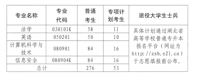 湖北警官学院今年专升本计划招生4个专业,其中"普通考生"和"专项考生"分专业计划如下: